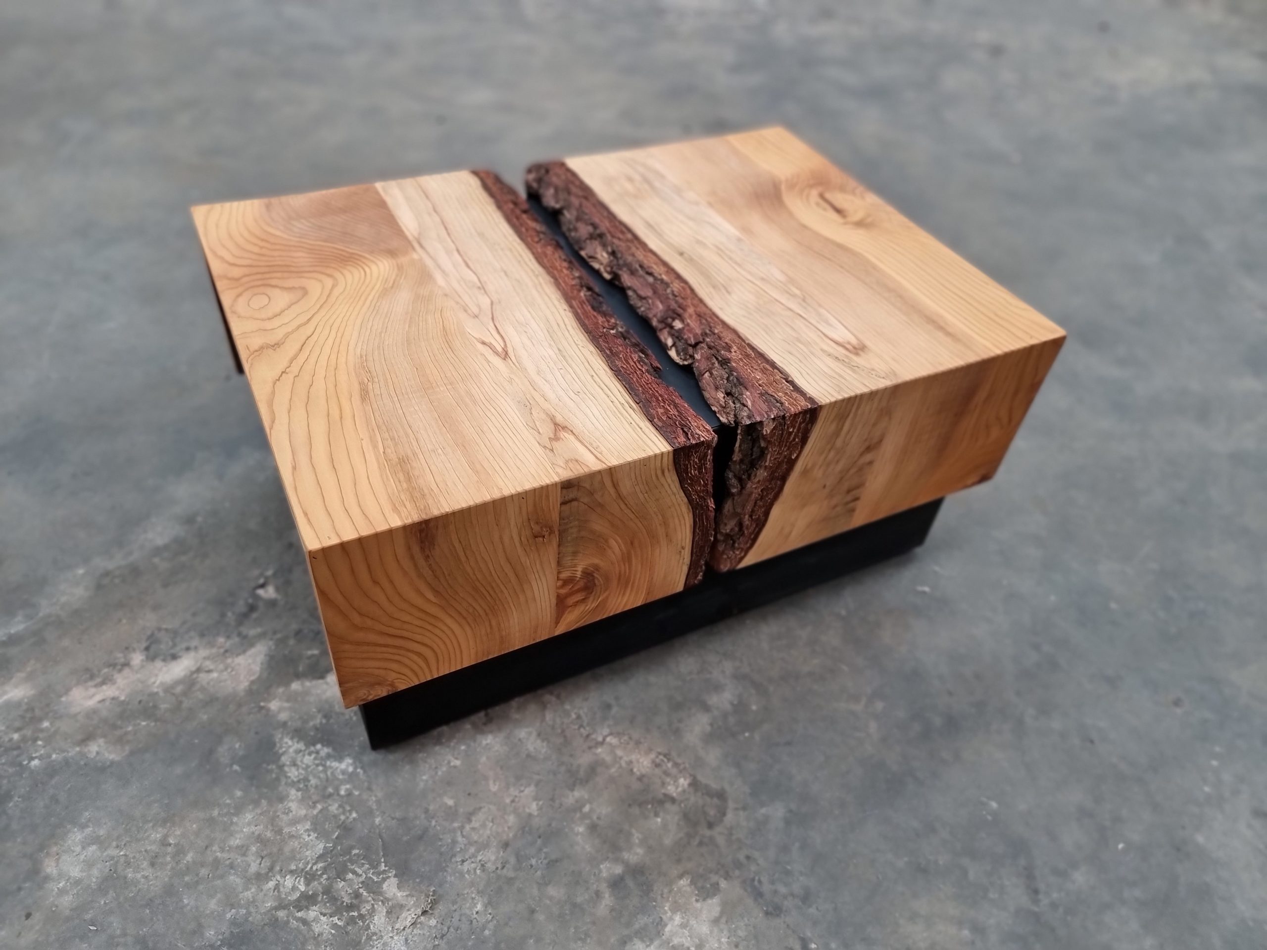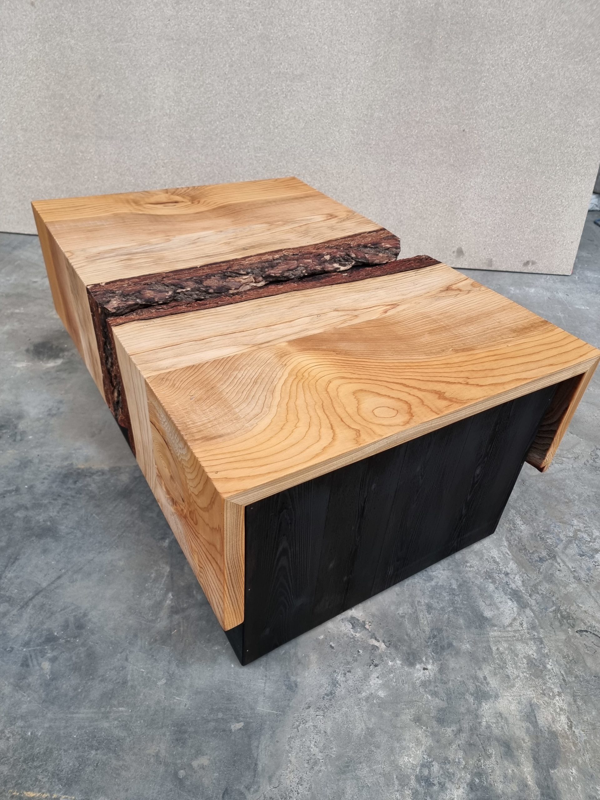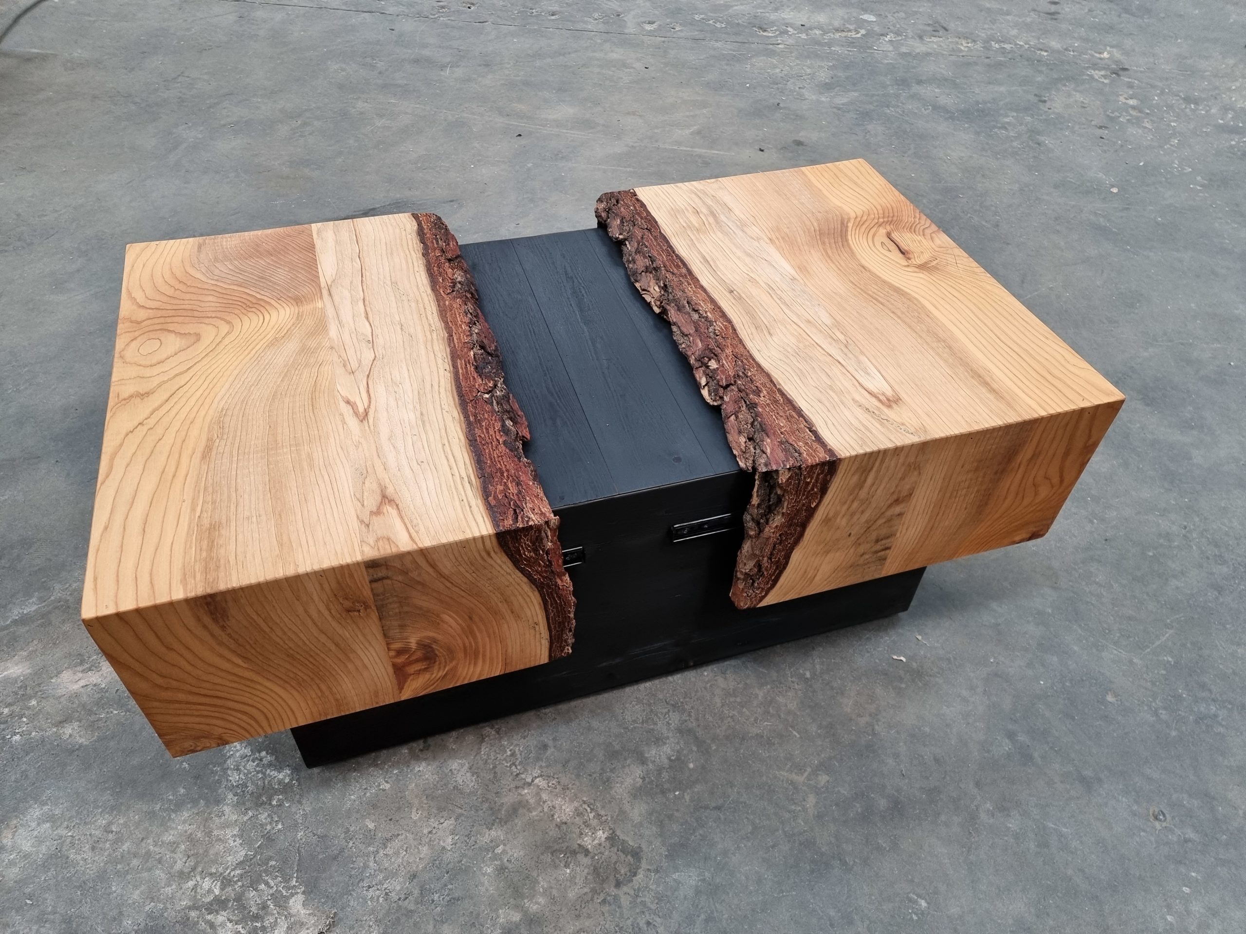 Cette table basse est fabriquée à partir d’un plateau brut en épicéa, avec son écorce, qui coulisse pour laisser place à un grand espace de rangement. Le tout repose sur une solide structure en mélèze massif, avec une finition en bois brûlé.